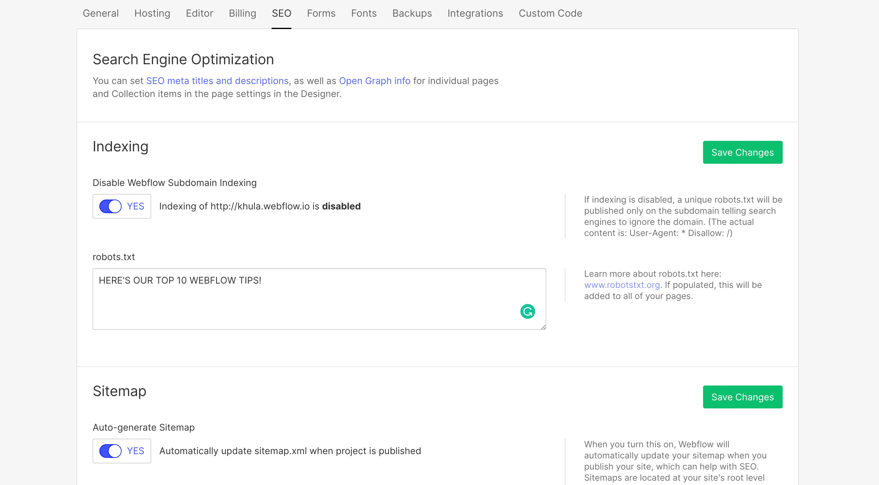 In Webflow, under the general tab in settings, these two areas give you a chance to bring your visual identity and brand across to your audience. Make sure you put a custom Favicon (normally your logo in a size format of 32px by 32px) and a nicely designed WebClip "sometimes known as touch icons" (logo and business name in a size format of 256px by 256px), which is used on devices.